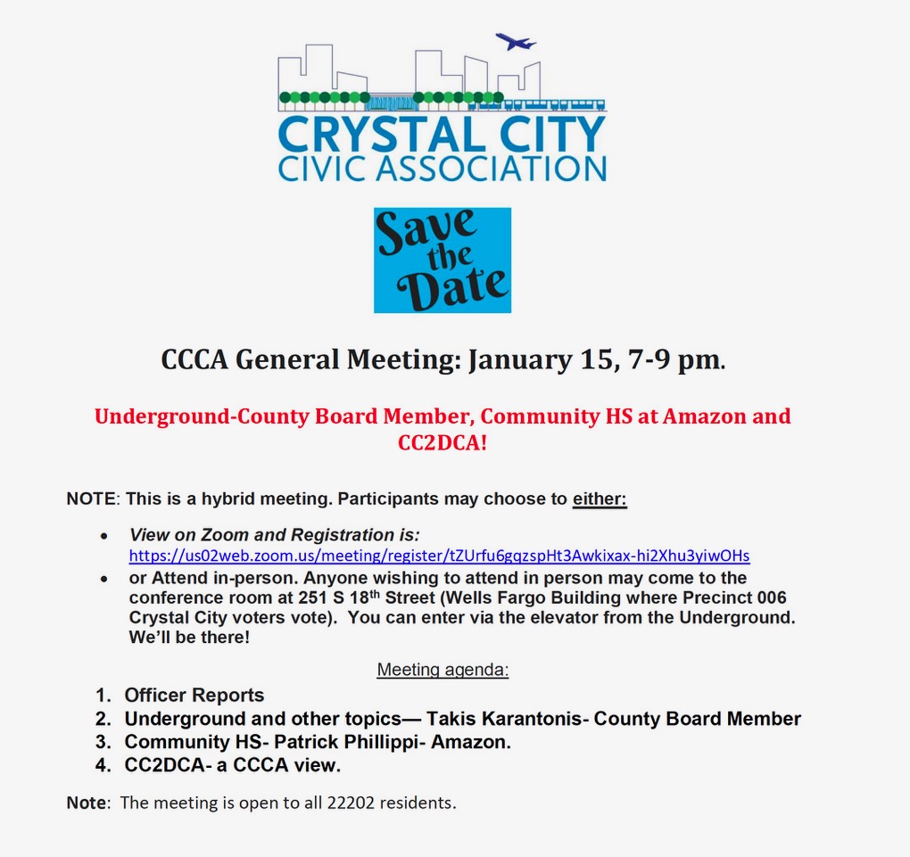 Message from CCCA’s President On September 14th (Wednesday) at 7pm we will have our next CCCA meeting. We will have an update from JBGS on all of their construction projects, a presentation by the County transportation staff on alternatives for Metro. We will have one more presentation that has not been…