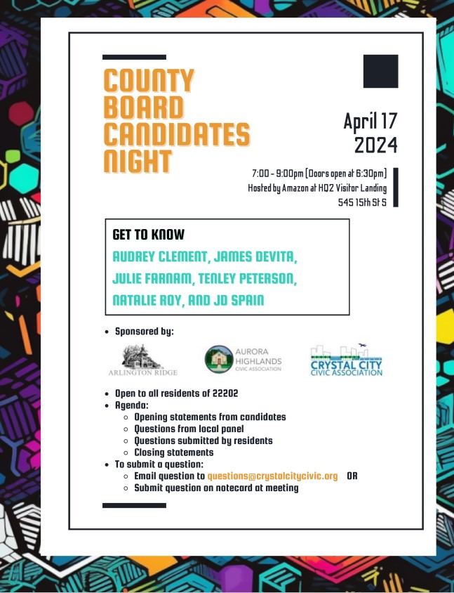 Livability22202, which consists of the three civic associations in 22202 zip code (Arlington Ridge, Aurora Highlands, Crystal City), has organized a Meet the County Board Candidates Night April 17 from 7-9 pm. The event is hosted by Amazon at its HQ2 Visitors Landing, 545 S. 15th Street. Doors will open at 6:30 pm.
